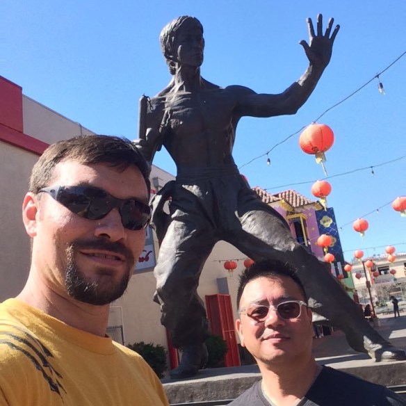 I have been training despite life’s many difficulties. I’v come to realize that being a parent multiples those difficulties exponentially. Job changes, preschool changes, Dr appointments, medical bills and all the other stresses. Despite all that I am still happy that my youngest son was born in July. I have pulled my training back some, no more out of town seminars. Really just training with my instructor on Thursdays and sharing with my Eskrima group on Sunday mornings. They are coming along and have pretty much got Cinco Teros down and are really getting into Lock n Block, and the flow drill. I have managed to attend two cool events since my last post. In September I taught an Escrima seminar for my friend Mario’s Gung Fu school. We went over the strikes of Cinco Teros, and the basic defenses for each strike. The students were very receptive and I hope to be back. In October my student and I attended the reopening of Bruce Lee’s Chinatown school in Los Angeles. This was truly an epic moment for each of us.
